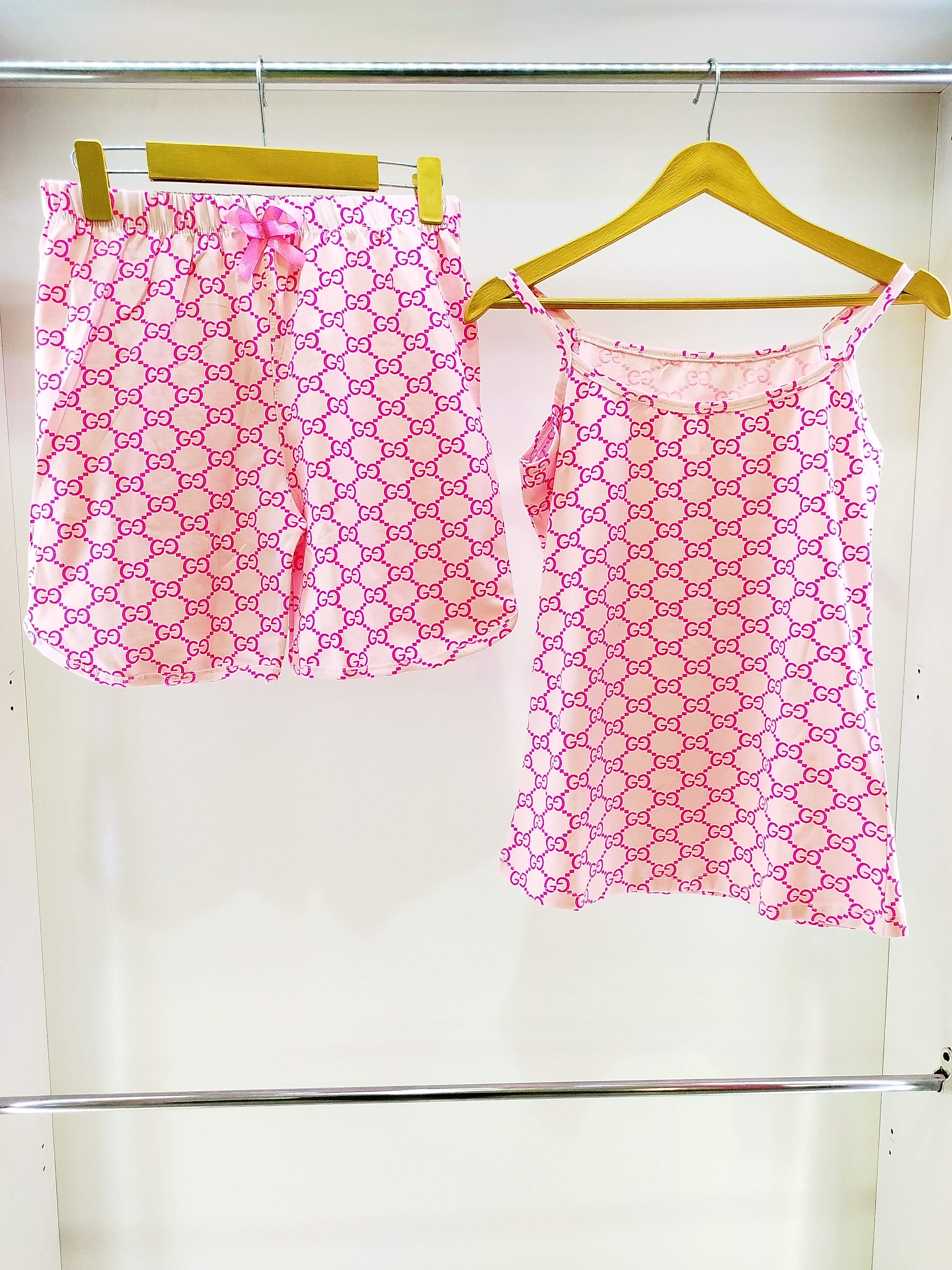 با ست تاپ و شورتک طرح Gucci صورتی، نهایت راحتی و جذابیت را تجربه کنید! این ست دوستداشتنی، با طرح زیبای Gucci و رنگ صورتی دلنشین، انتخابی عالی برای دختران و بانوانی است که به دنبال لباسی راحت، باکیفیت و در عین حال شیک برای روزهای گرم، استراحت در منزل یا فعالیتهای روزمره هستند.