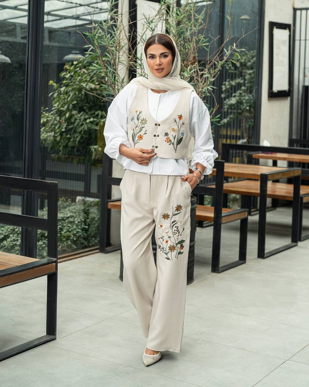 ناموجودست سه تیکه وست ، شومیز و شلوار پارچه کرپ گلدوزی